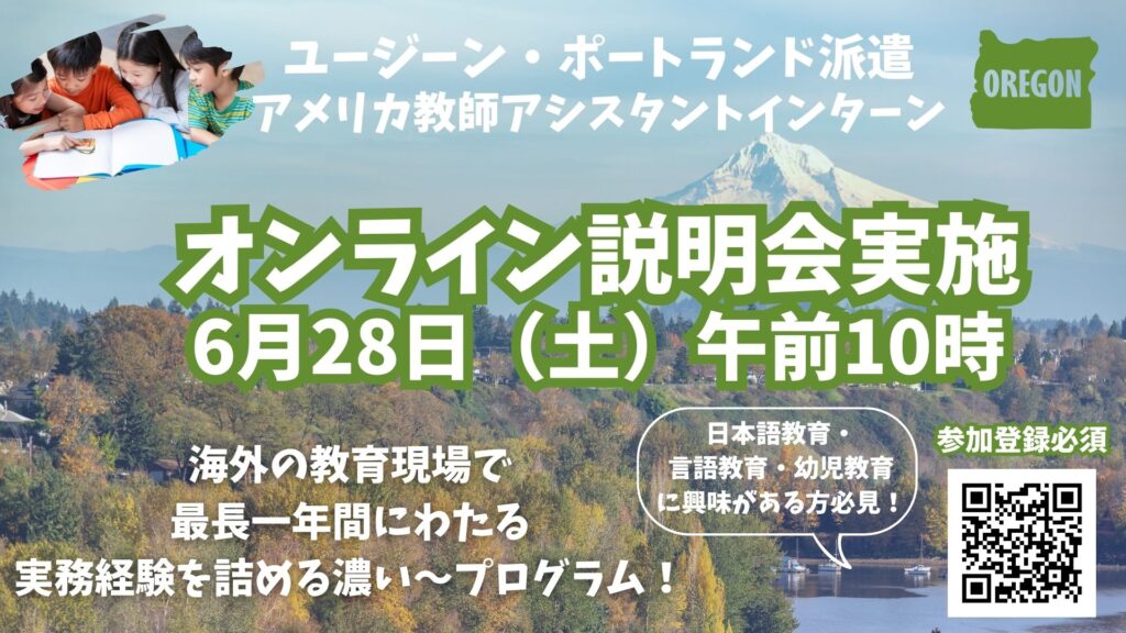 2026年派遣はポートランドフォーカスで説明会を実施しておりましたが、今回今年初ユージーン派遣も含めてプログラム説明会を実施いたします!日本語教育・言語教育・幼児教育に興味がある方にとっては大変濃い経験ができるプログラムですので、まずは説明会にてプログラムの詳細をお伝えさせていただきます!