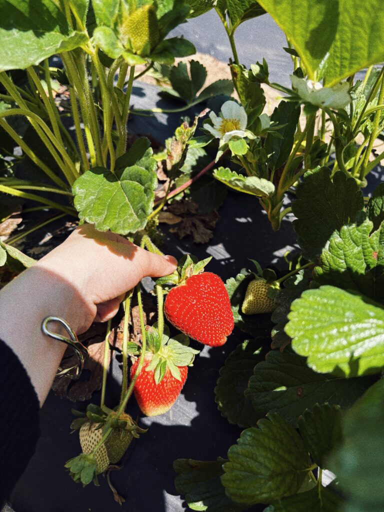 日本のイチゴ狩りはビニールハウスの中で行うイメージでしたが、ここは青空の下、広大な敷地の中でかがんでイチゴを摘んでいくスタイル。より自然を感じられる環境が楽しかったです。
