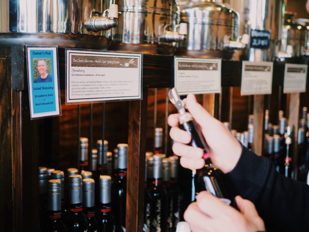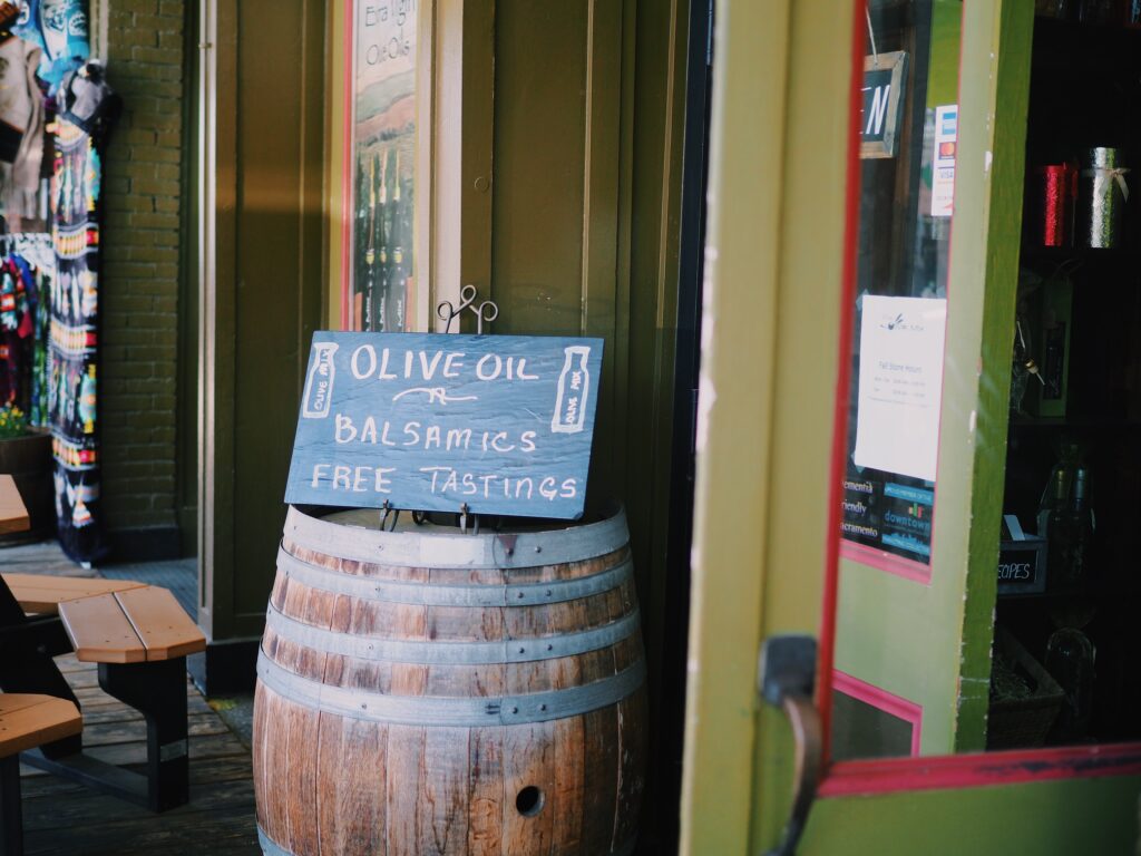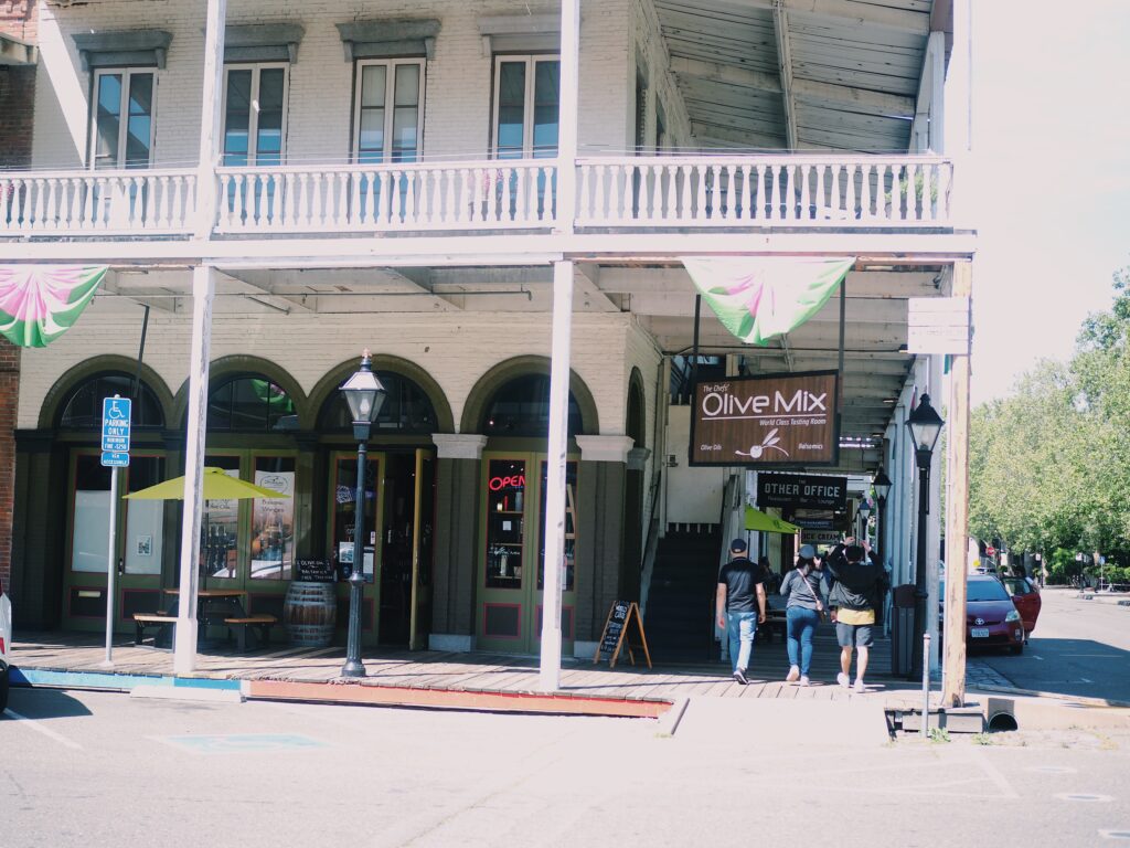 オールドサクラメント内のショップで私の一押しはオリーブミックス!様々なフレ-バーのオリーブオイルやバルサミコ酢が置いてあるお店です。