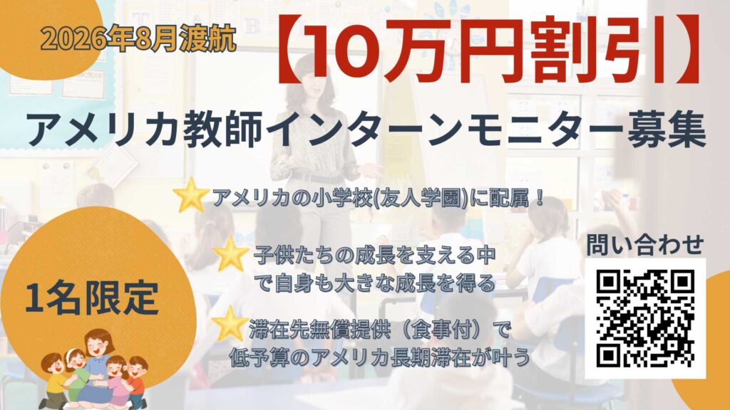 教育現場での実践的な経験ができるだけでなく、無償のホームステイ(3食付き)が提供されるため、低予算でアメリカに長期滞在できる点も大きな魅力です。