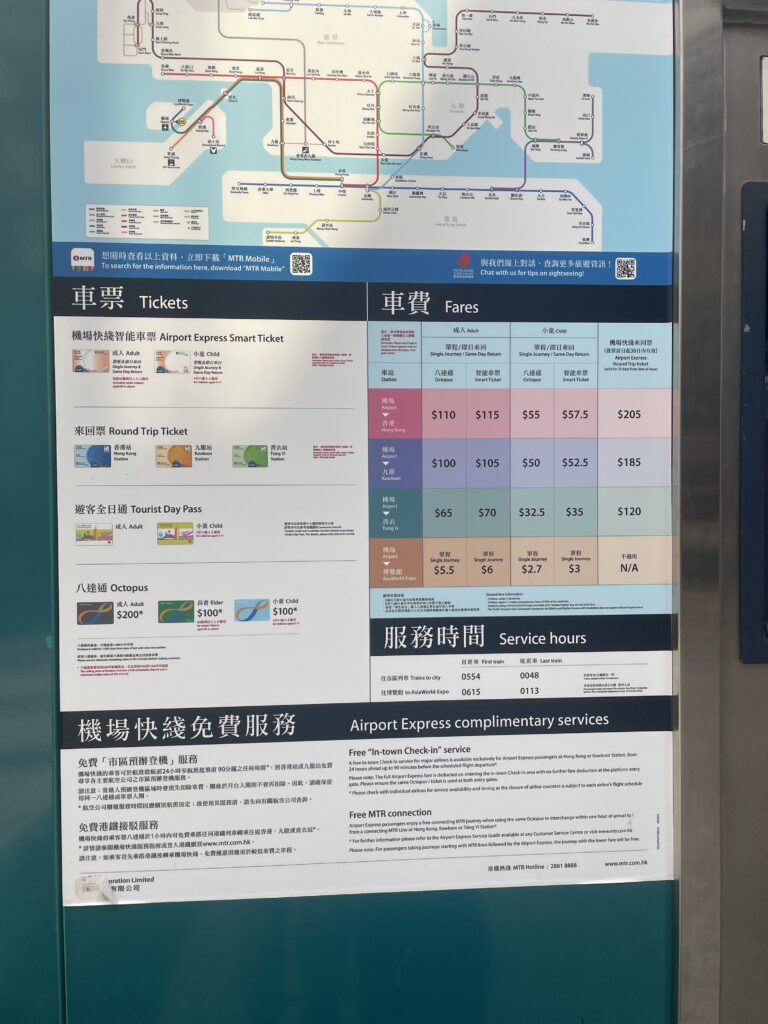 駅内のマップをみて、空港駅からホテルの最寄りである尖沙咀駅までのアクセスを確かめます。