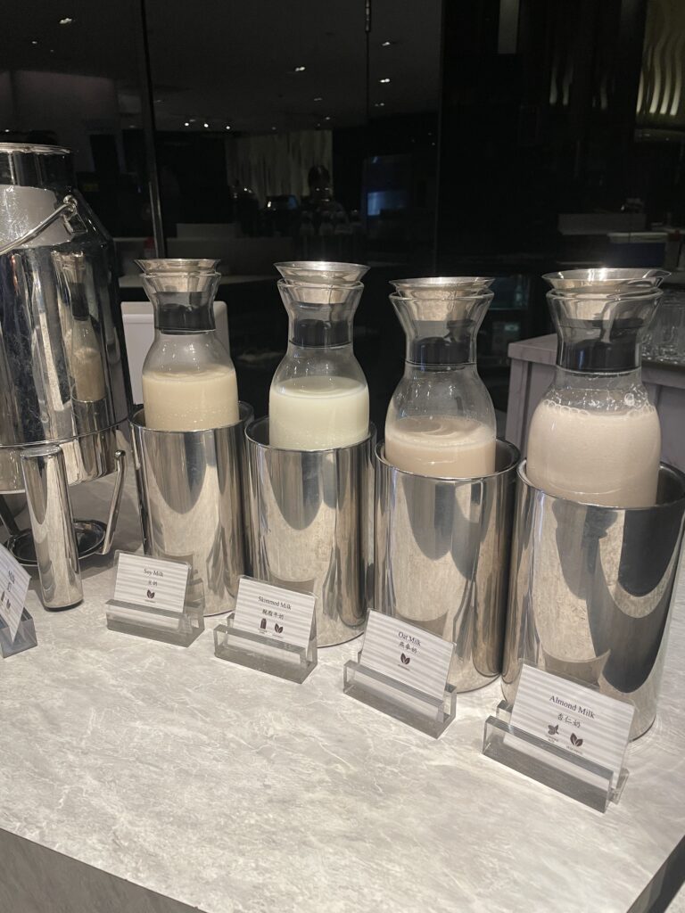 私は乳製品をできるだけ避けていまして、日本のカフェだとミルクをプラントベースに変更できる場所が少ないなと感じています。しかし香港ではどこに行ってもプラントベースや豆乳のオプションがあり、ホテルの朝食ビュッフェでもシリアルコーナーの牛乳の横に豆乳のディスペンサーも用意されていて、大変ありがたかったです。