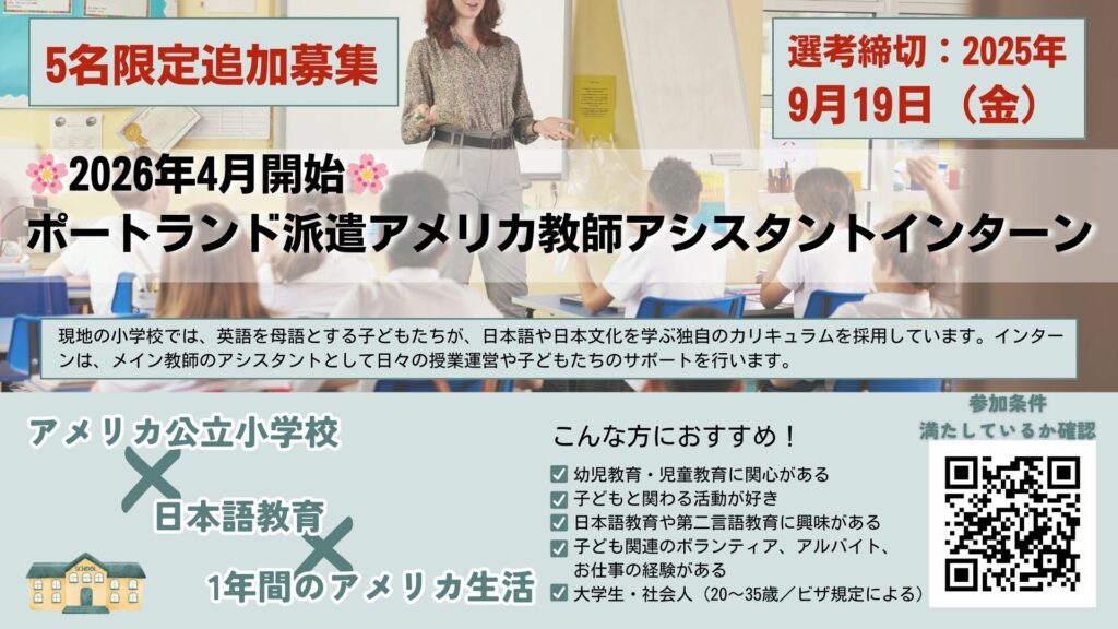 【5名限定・最終募集】ポートランド2026年派遣アメリカ教師アシスタント・インターン追加募集!【締切9月19日】