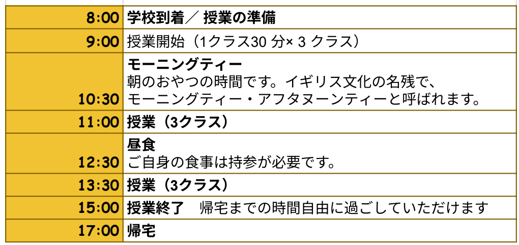 学生はオプションクラスも含め1日最大10コマの授業を受講でき、各自の選択したコースに従って、マンツーマン授業とグループ授業を受けることになります。